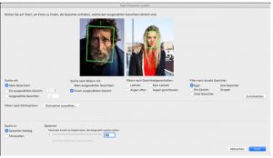 Die Suche nach Gesichtern findet Fotos, die ein, zwei oder mehrere frontale Gesichter beinhalten. Falls die Anzahl der Gesichter keine Rolle spielt, sollten sie die Einstellung „egal“ wählen. Die Option „Porträt“ ermöglicht das Finden von Fotos von einzelnen frontalen Gesichtern, die ein Foto fast vollständig ausfüllen.