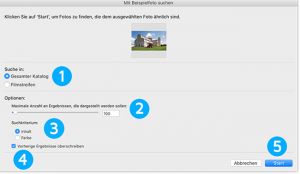 Die maximale Anzahl an Suchergebnissen ist auf 5000 Fotos begrenzt, da größere Ergebnismengen mehr Zeit zur Darstellung benötigen und diese Menge ausreichend sein sollte. Falls sie Suchergebnisse nicht speichern möchten, aktivieren sie einfach die „Vorherige Ergebnisse überschreiben“ Option. Andernfalls werden Suchergebnisse gespeichert und in einer eigenen Sammlungs-Hierarchie gespeichert.